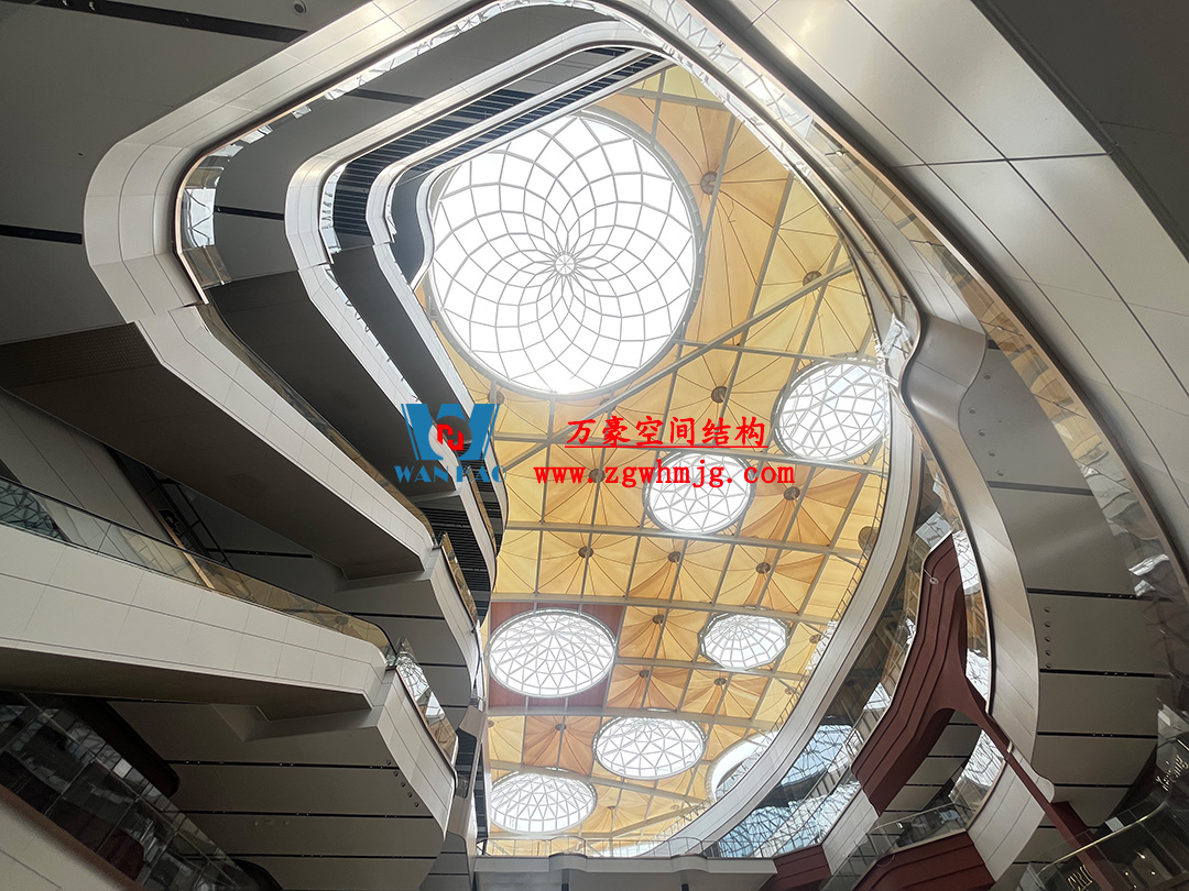 鳳凰新天地商業(yè)街天幕項目位于廣州市從化區(qū),商業(yè)街總建筑面積約7.6萬㎡,天幕主體結(jié)構(gòu)采用大跨度空間鋼結(jié)構(gòu),鋼結(jié)構(gòu)上方覆蓋ETFE+PTFE膜結(jié)構(gòu)。膜面積總展開超3000平方米。商業(yè)街有地下兩層停車場,地上五層城市商業(yè)綜合體,商業(yè)街緊鄰G105中心廊道,交通區(qū)位優(yōu)勢明顯。天幕造型宛如一只展翅欲飛的鳳凰,與“鳳凰新天地”項目名稱相呼應(yīng),寓意著從化區(qū)蓬勃發(fā)展的美好未來。