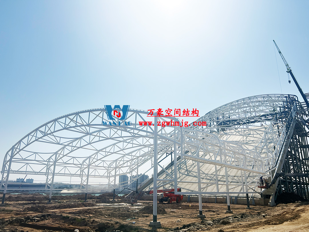 比亞迪紹興嵊州賽車場(chǎng)以極速競(jìng)技與自然景觀的融合為設(shè)計(jì)核心,干拔沙坡觀景平臺(tái)作為賽道的標(biāo)志性節(jié)點(diǎn),同時(shí)滿足了功能性、標(biāo)志性與生態(tài)協(xié)調(diào)性。設(shè)計(jì)靈感來源于賽車疾馳時(shí)揚(yáng)起的沙浪與風(fēng)動(dòng)軌跡,通過鋼結(jié)構(gòu)的剛性骨架與膜材的柔性質(zhì)感,塑造出如沙丘起伏般的動(dòng)態(tài)形態(tài),既呼應(yīng)賽車場(chǎng)的速度美學(xué),又為觀眾提供遮陽避雨的舒適空間。該項(xiàng)目PTFE膜屋面展開超3萬平方米。