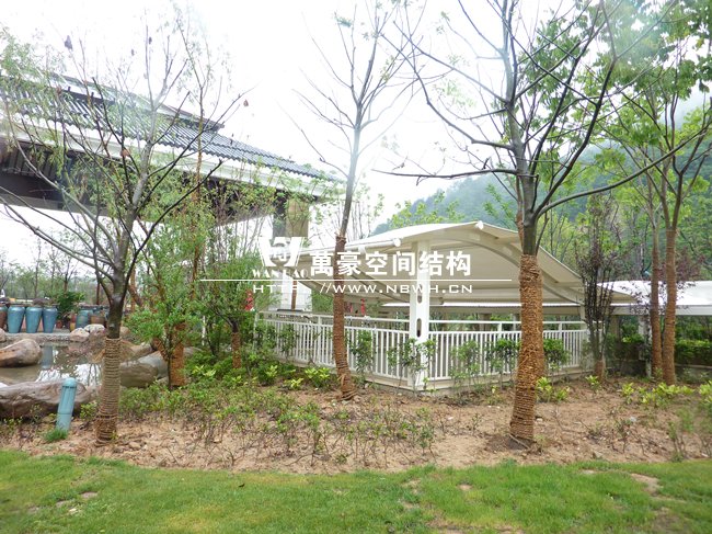 陽(yáng)明溫泉山莊車(chē)庫(kù)出入口膜結(jié)構(gòu) 福建酒店張拉膜結(jié)構(gòu)頂棚 餐廳膜結(jié)構(gòu)建筑案例