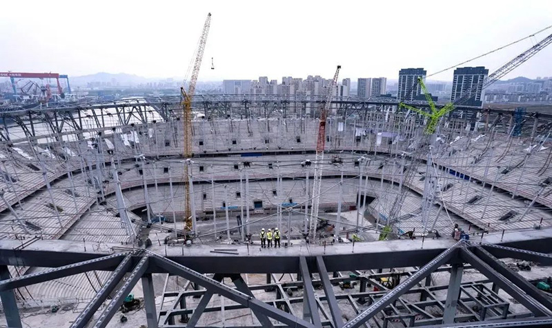 屋面為雙層索網(wǎng)結(jié)構(gòu),上層索斜向布置,每根斜索與其他另外5根斜向索交叉,交叉點通過索夾連接,新穎獨特的結(jié)構(gòu)形式對位形的控制和索夾的安裝時機提出了極高的要求。另外,該項目拉索的規(guī)格大,索的內(nèi)力大,總的提升荷載在國內(nèi)同類型體育場中最大。此外,大連所處的地理位置又使得項目關(guān)鍵的提升階段面臨著冬季施工和大風(fēng)施工的挑戰(zhàn)。針對項目的重、難點,最終確定引入附加索和張拉的方式解決提升過程中受力過大的問題,最大限度的保證施工的安全。項目于2020年10月開工建設(shè),計劃2022年12月建成驗收并開始試運行,擬定于2023年4月舉辦測試賽,于2023年6月至7月正式承辦亞洲杯。