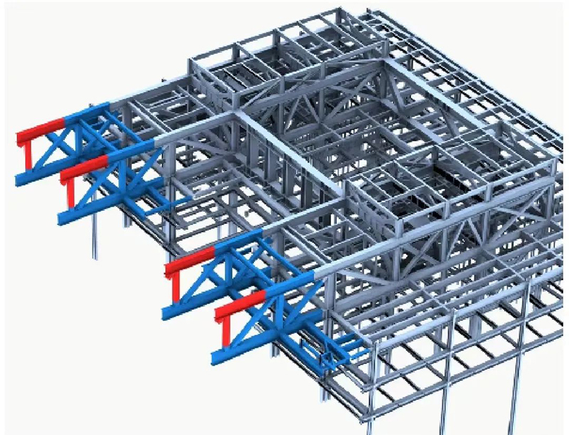在設(shè)計之初,為保證建筑視覺效果,懸挑沒有使用任何頂撐或懸拉結(jié)構(gòu)。特別是項目外挑達(dá)28米的38層懸挑平臺桁架及鋼梁重量共約750噸,面積達(dá)1657.6平方米,約4個標(biāo)準(zhǔn)籃球場大小,是國內(nèi)最大單邊懸挑結(jié)構(gòu)。1毫米的拉伸變形都會帶來結(jié)構(gòu)安全隱患,沒有任何下頂上拉結(jié)構(gòu)的設(shè)計,將讓核心筒頂部產(chǎn)生100毫米的拉伸變形。在懸挑施工過程中,為避免懸挑后跨拉力對混凝土產(chǎn)生破壞,項目采用“埋設(shè)預(yù)應(yīng)力鋼拉桿抵消剩余拉力”的方案,即通過在外墻設(shè)置8條預(yù)應(yīng)力鋼棒,增加后張預(yù)應(yīng)力來抵消拉力。通過這種“借力打力”的方式,巧妙地將樓板的重量轉(zhuǎn)移回核心筒,消除拉伸變形。變形問題解決好了,實際的安裝又面臨挑戰(zhàn)。由于懸挑長度長、單根構(gòu)件重,且位于200米高空中,安裝時無法在下方設(shè)置臨時支撐,這給懸挑安裝又帶來一大難題。為保證懸挑順利安裝,項目采用分段吊裝的方式進(jìn)行安裝。像拼接“樂高”積木一樣,在懸挑構(gòu)件接口處運(yùn)用臨時固定連接板、卡馬板進(jìn)行輔助,再進(jìn)行構(gòu)件安裝校正,確保了單根構(gòu)件安裝的精準(zhǔn)度以及安全性