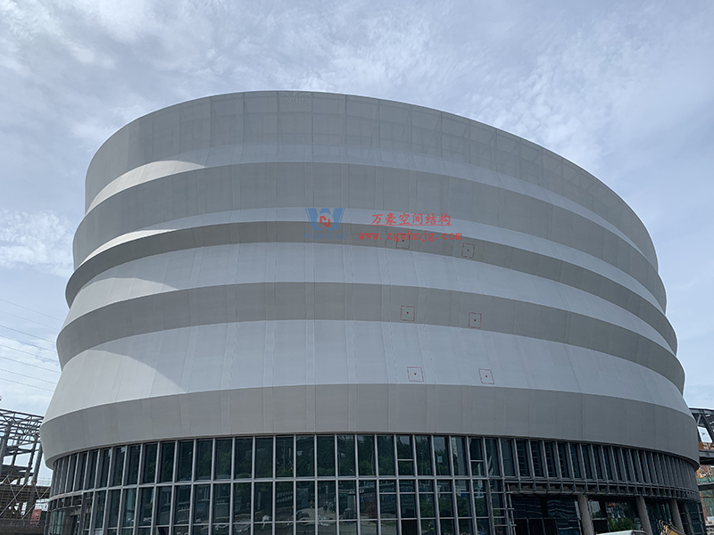 由萬豪承建的紹興國際會展館中心外立面網(wǎng)格織物膜,由5凸5凹不同標(biāo)高的柔線組合成飄絲帶,視覺效果極具沖擊力。
