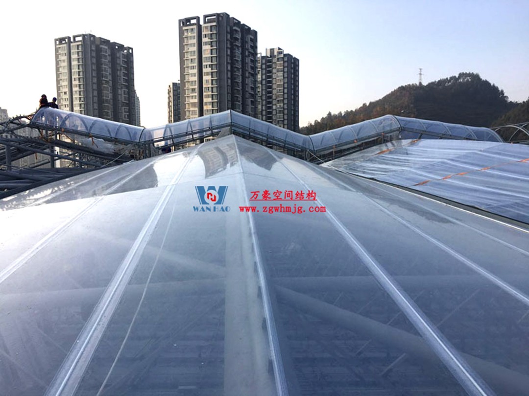 遵義高鐵新城商業(yè)天幕是由萬豪承建,該項目主體鋼結(jié)構(gòu)為張懸梁體系,總用鋼結(jié)構(gòu)1660噸,總用膜面積12200平方米,天幕采用ETFE單層透明膜,內(nèi)部安裝的全屏LED燈光,天幕中間增設(shè)排煙天窗,整體設(shè)計呈現(xiàn)出了延綿起伏的落差動感,猶如一條栩栩如生的長龍。