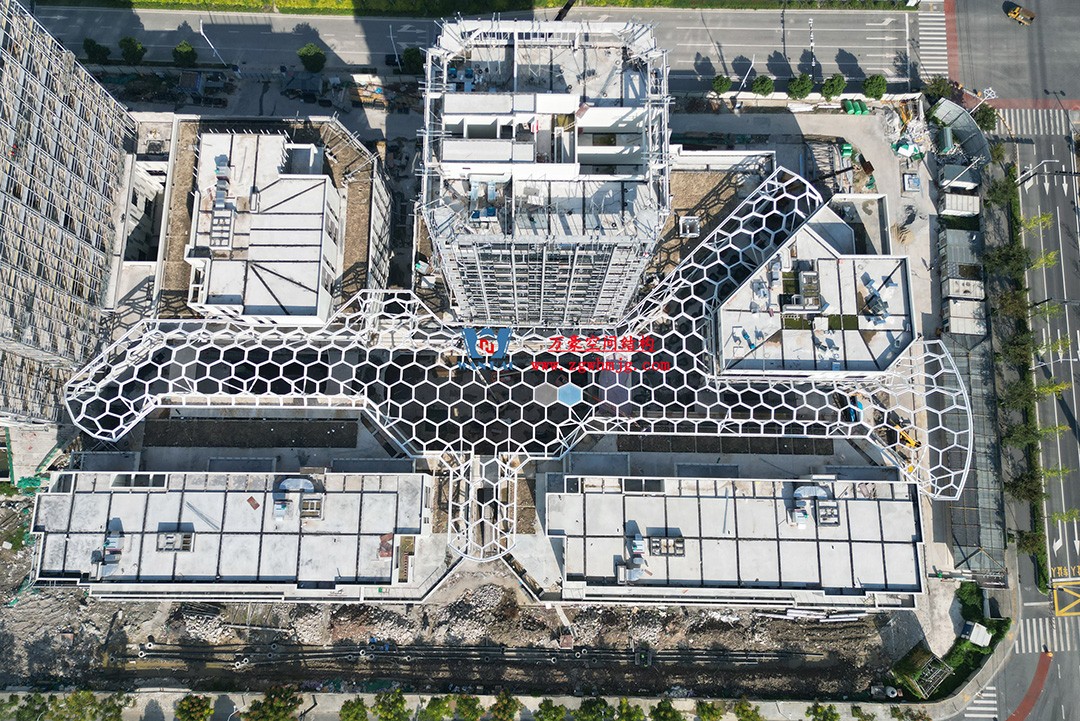 嘉興長安里商業(yè)街天幕的創(chuàng)作理念,以“蜂巢”為生命的空間,給人虛幻、靈動、可變的感覺。為了體現(xiàn)這一理念,設(shè)計師將蜂巢的概念深化,不僅利用空間鋼結(jié)構(gòu)的可變性作為基底,形成大大小小不規(guī)則多邊形框架,還利用其獨特的結(jié)構(gòu)特點,通過覆蓋的ETFE膜結(jié)構(gòu)氣枕膜賦予了建筑更加豐滿的外貌,使其具有獨特的視覺效果和感受,輪廓和外觀因此變得柔和,天幕的神韻得到了完美的體現(xiàn)。 天幕膜結(jié)構(gòu)氣枕上布滿了肉眼看不見的鍍點,當(dāng)陽光進入場館內(nèi)要通過鍍點的過濾,一部分光線會被鍍點反射回空中,這些鍍點就起到反射光線的作用,夢幻般的淡藍色來自氣枕的第一層薄膜結(jié)構(gòu),也因為彎曲的表面可以反射陽光,使整個建筑在陽光照射下更加晶瑩剔透,流線型的結(jié)構(gòu),既能在炎熱季節(jié)遮陽通風(fēng),又能給商業(yè)街區(qū)提供充分柔和的自然光。 大跨度的鋼結(jié)構(gòu)網(wǎng)殼結(jié)構(gòu)創(chuàng)造的中庭空間寬敞明亮,可容納川流不息的人群,一掃傳統(tǒng)商業(yè)街繁冗、沉重、空間擁堵的弊端,帶來一股清新簡潔的商業(yè)設(shè)施建筑風(fēng)格。膜結(jié)構(gòu)使得建筑輕盈感十足,膜材料的良好透性使得建筑界面透光而不透視。由于該材料(ETFE)氣枕在陽光底下富有通透感光線可以通過漫射和折射進入界面,讓整個商業(yè)街呈現(xiàn)出朦朧夢幻之美。