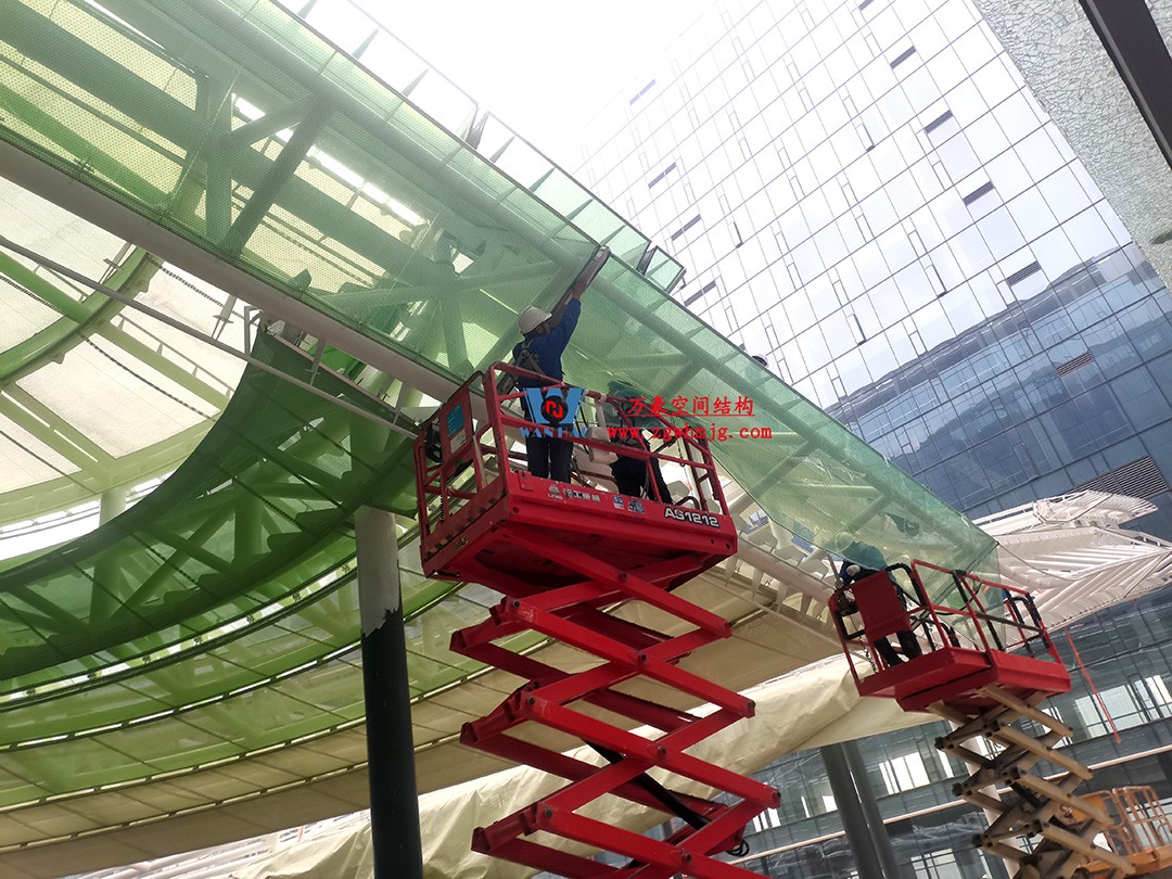 鏡頭轉(zhuǎn)到項(xiàng)目膜結(jié)構(gòu)施工現(xiàn)場(chǎng),工地之上非常繁忙。據(jù)項(xiàng)目經(jīng)理反饋,目前已進(jìn)行到ETFE膜安裝作業(yè)事項(xiàng),現(xiàn)在正在逐層次對(duì)膜體張拉,正在進(jìn)行膜結(jié)構(gòu)的大面積安裝。 杭州博多森谷ETFE氣枕連廊天幕項(xiàng)目作為公司重點(diǎn)工程,項(xiàng)目自承接以來(lái)便受到廣泛關(guān)注,從基礎(chǔ)預(yù)埋、鋼柱吊裝拼接,到鋼結(jié)構(gòu)桁架整體圓滿完成,再到今日膜結(jié)構(gòu)張拉安裝任務(wù),充分展現(xiàn)了我們?nèi)f豪人高度的責(zé)任擔(dān)當(dāng),用實(shí)際行動(dòng)證明了我們?nèi)f豪人“不懼困難,迎難而上,能打硬仗,敢打硬仗,善打硬仗”的優(yōu)良作風(fēng)。萬(wàn)豪空間結(jié)構(gòu)將繼續(xù)秉持做精品工程的思想理念,為鋼膜結(jié)構(gòu)建筑領(lǐng)域發(fā)展做出貢獻(xiàn)。 我們會(huì)繼續(xù)擔(dān)當(dāng)責(zé)任,高效協(xié)作,實(shí)時(shí)管控工程進(jìn)度,為“保質(zhì)保量交付”呈上一份滿意的答卷!