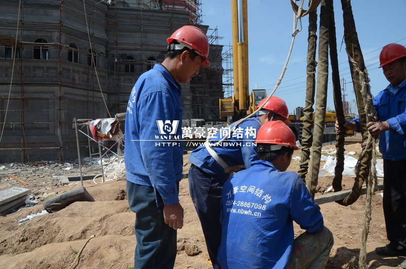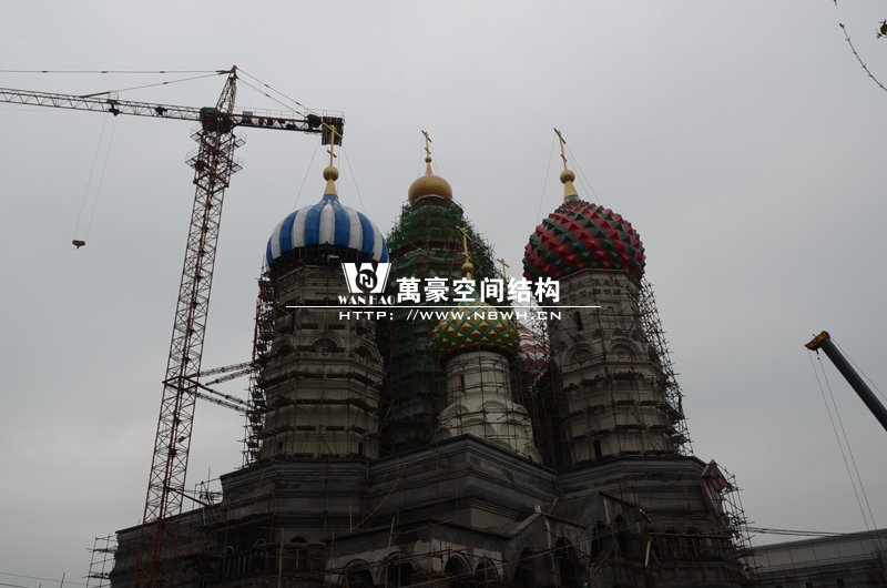橫店圓明新園俄羅斯館屋頂整體吊裝順利完成,300多噸的大吊車,20多噸重的鋼結構裝飾球,80米高的作業(yè)平臺,在萬豪現場管理人員和工人的緊密協(xié)調下,經過一周的晝夜努力終于大功告成,本次吊裝從4月17日開始,前期天氣晴朗無風,是吊裝的好天氣,吊裝也是順利進行,之后的幾天陰雨不斷,大家為了吊裝盡快順利完成,在雨小的時候冒雨進行吊裝,終于在4月22日吊裝正式完成。