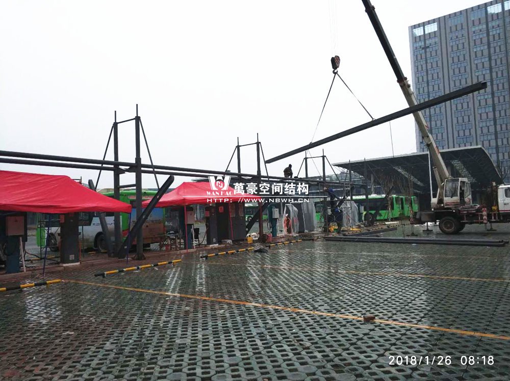 而本工程位于岳池火車站的對(duì)面的客運(yùn)中心,是比亞迪公交車充電樁的附屬設(shè)施。工程總用鋼量達(dá)8噸,膜材面積400平方米,以雙挑的形式為現(xiàn)場(chǎng)的充電樁遮陽(yáng)擋雨。
